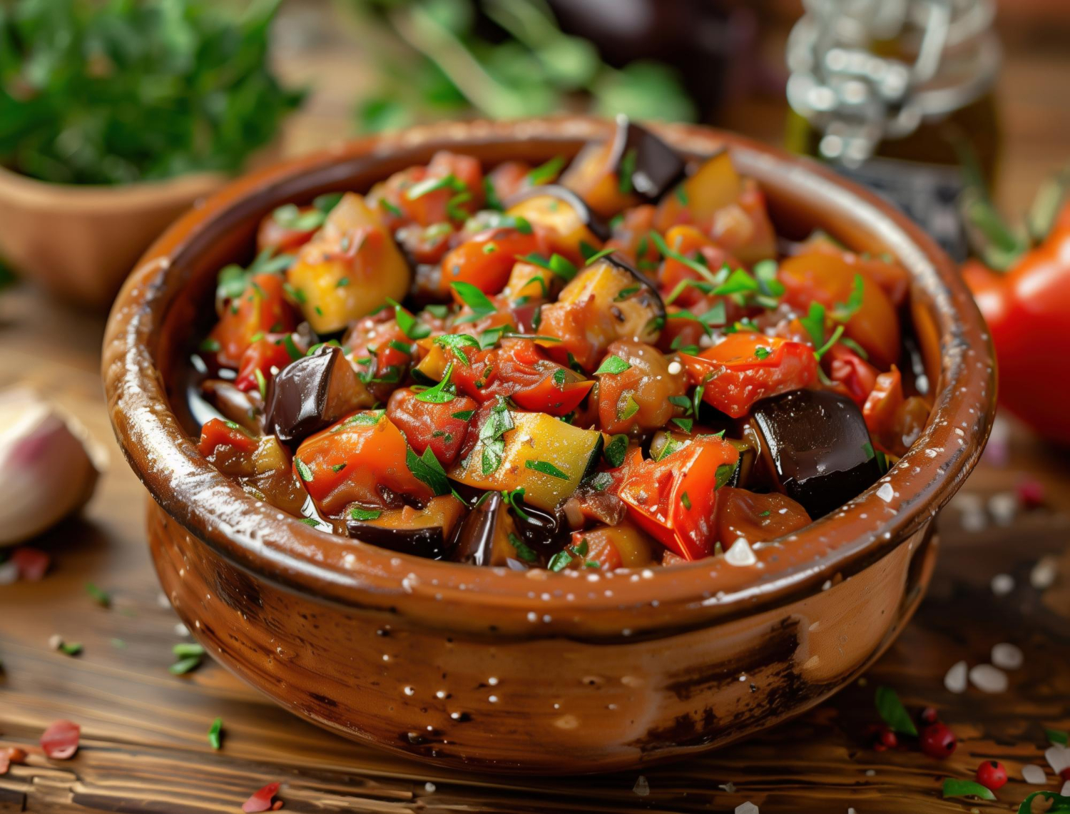 4.На сковороде обжариваем на растительном масле сначала баклажаны, убираем их со сковороды, и жарим остальные овощи (помидоры кладем позже всех). Когда все более-менее протушилось, добавляем мелко нарезанную зелень и чеснок.